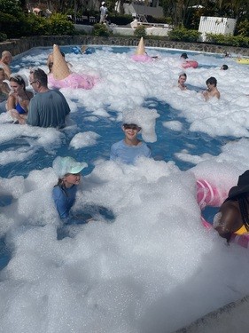 The resort pool, the tropical ocean water, the paddle boards, Hobbie cats, and inflatable climbing wall in